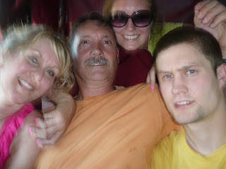 The insanely hot bus; Nick on top of the engine. Yea, we had to trade off sitting back there, it was the only way to get to Sheki